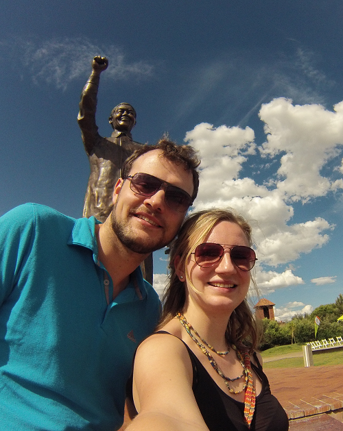 Zwei Reisende vor der Madiba Statue auf dem Naval Hill.