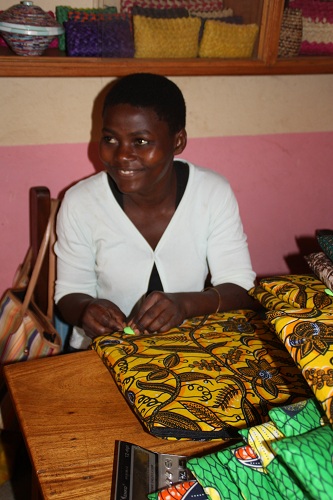 Eine Alumni der 2013 Klasse des Vocational and Business Trainings näht die dots an die neuen Laptoptaschen…